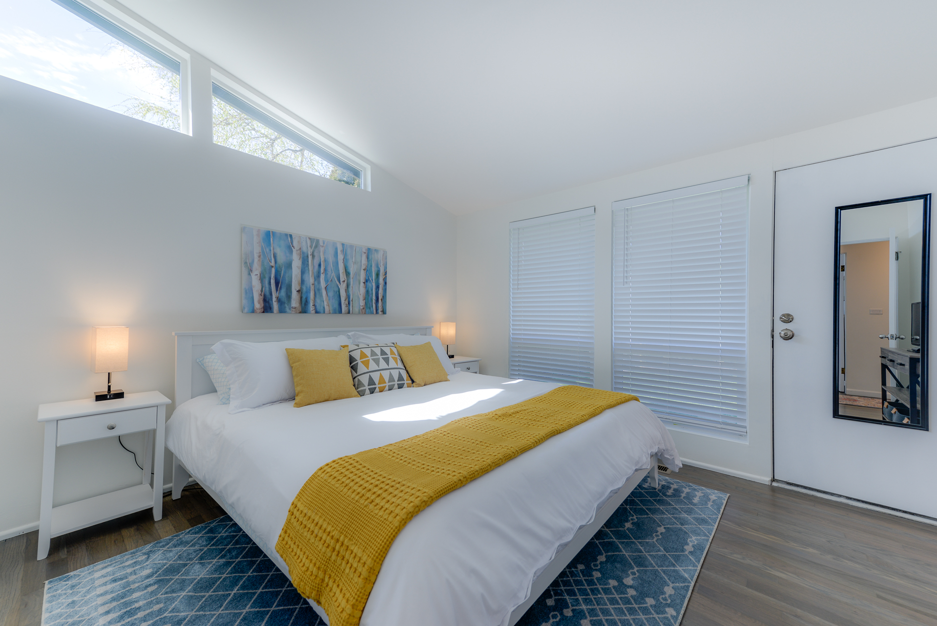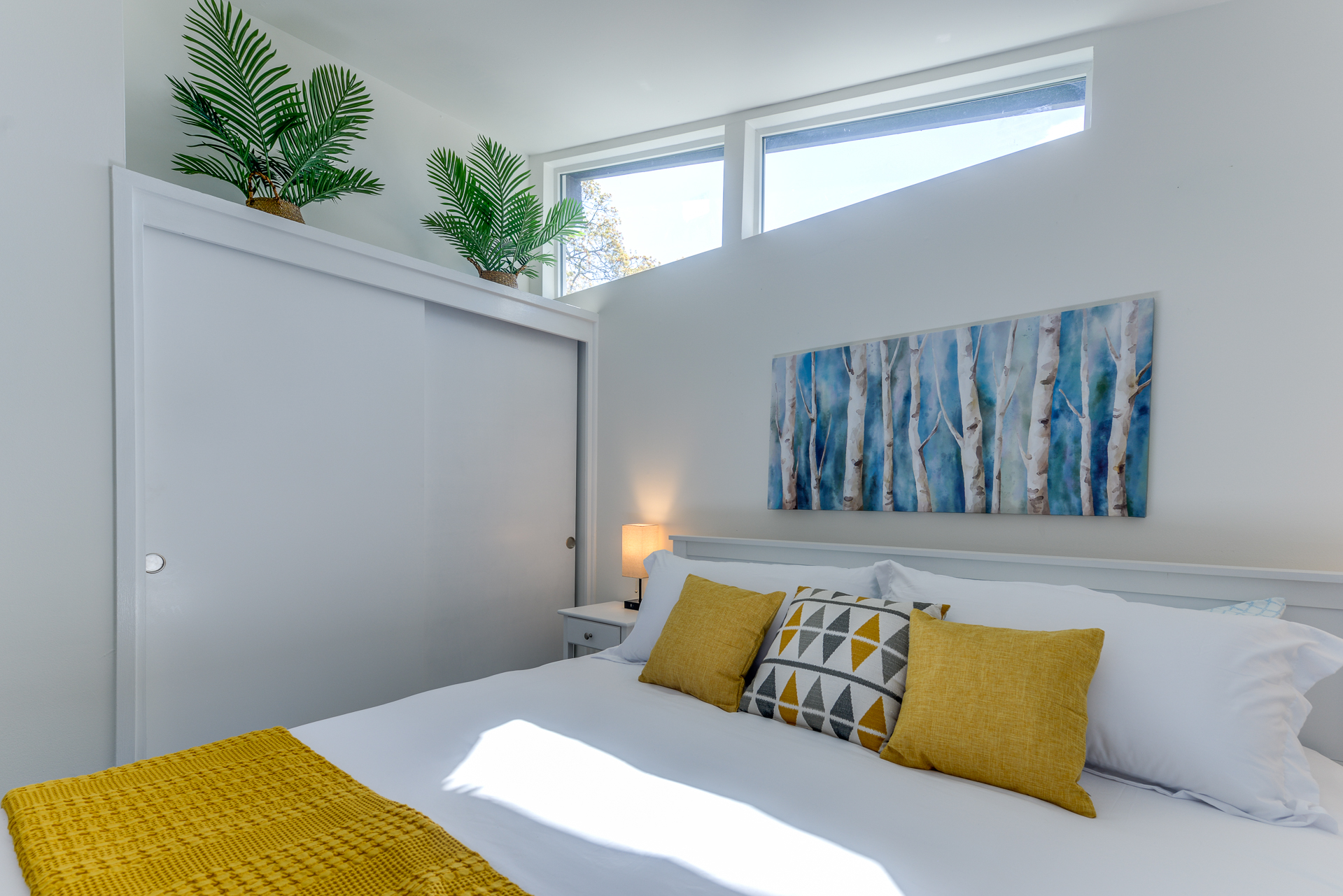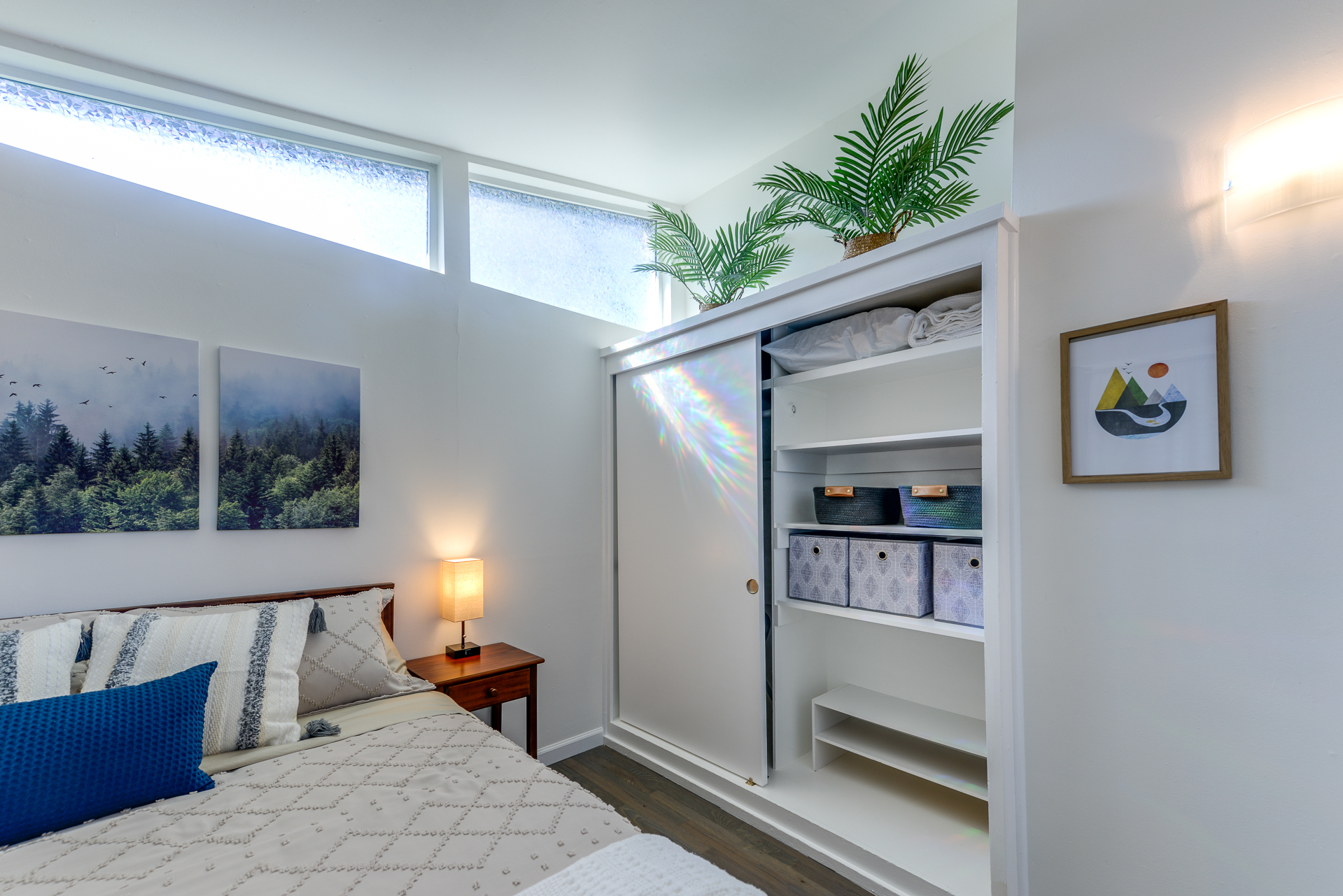 Enjoy the spacious Queen Room, also with a brand-new Casper mattress in queen size, sumptuous linens, along with bedside tables with lamps, drawers, and shelves. Take in the mid-century-modern architecture – especially evident in the bedrooms. Lull yourself to sleep watching the 32” Visio smart TV. You’ll have a closet and shoe rack for storage and a comfy side chair for relaxing, reading, or getting dressed.
