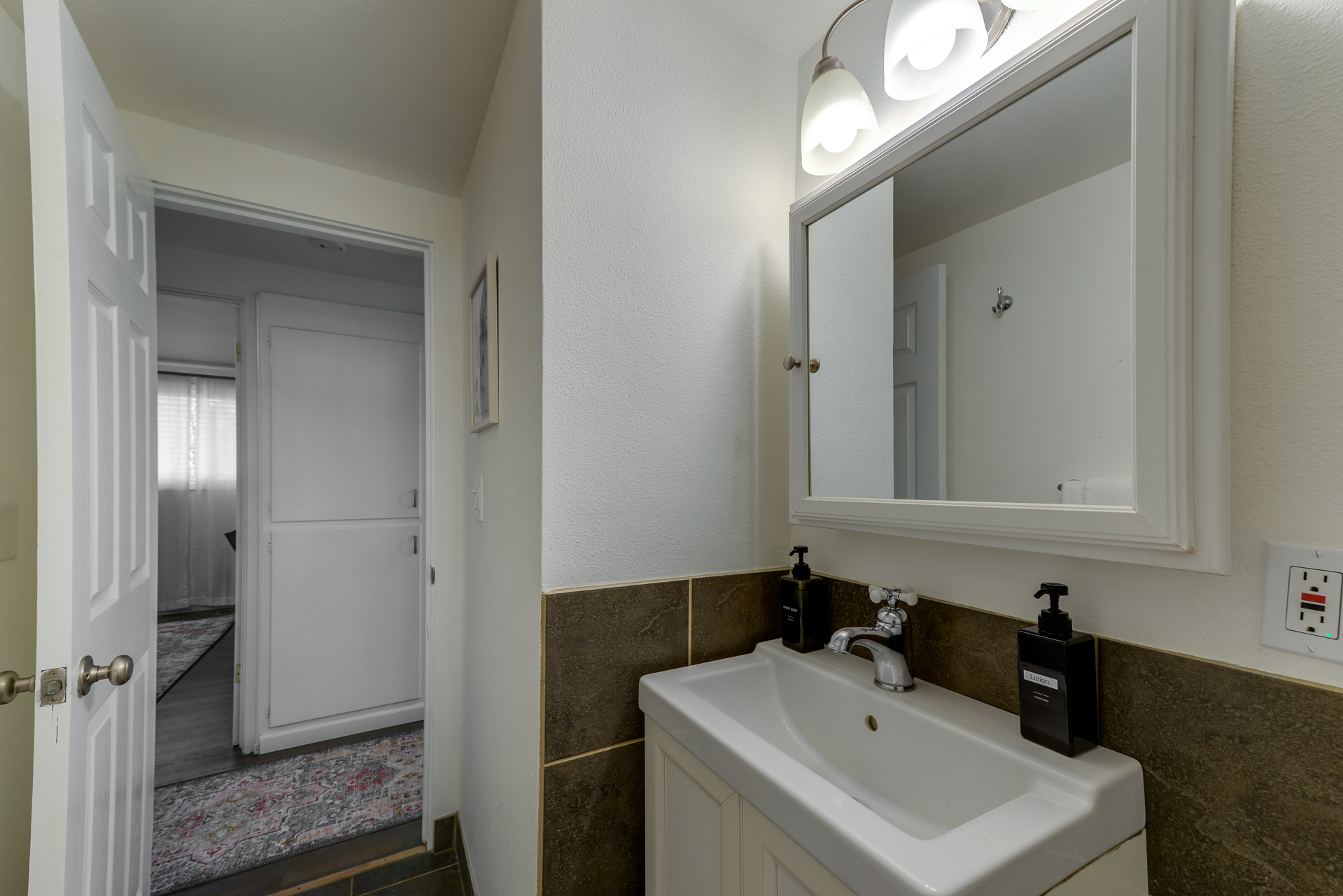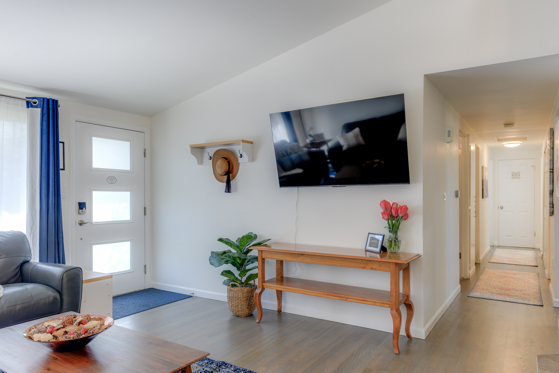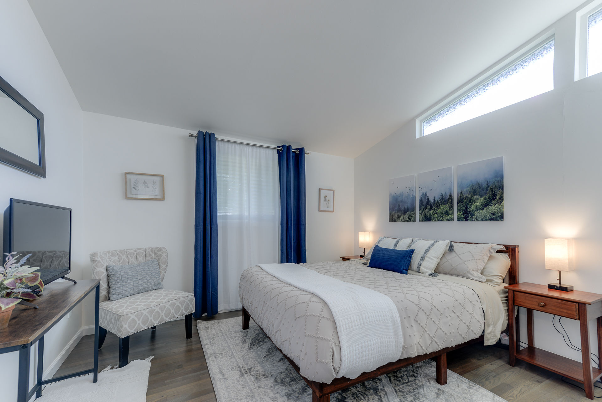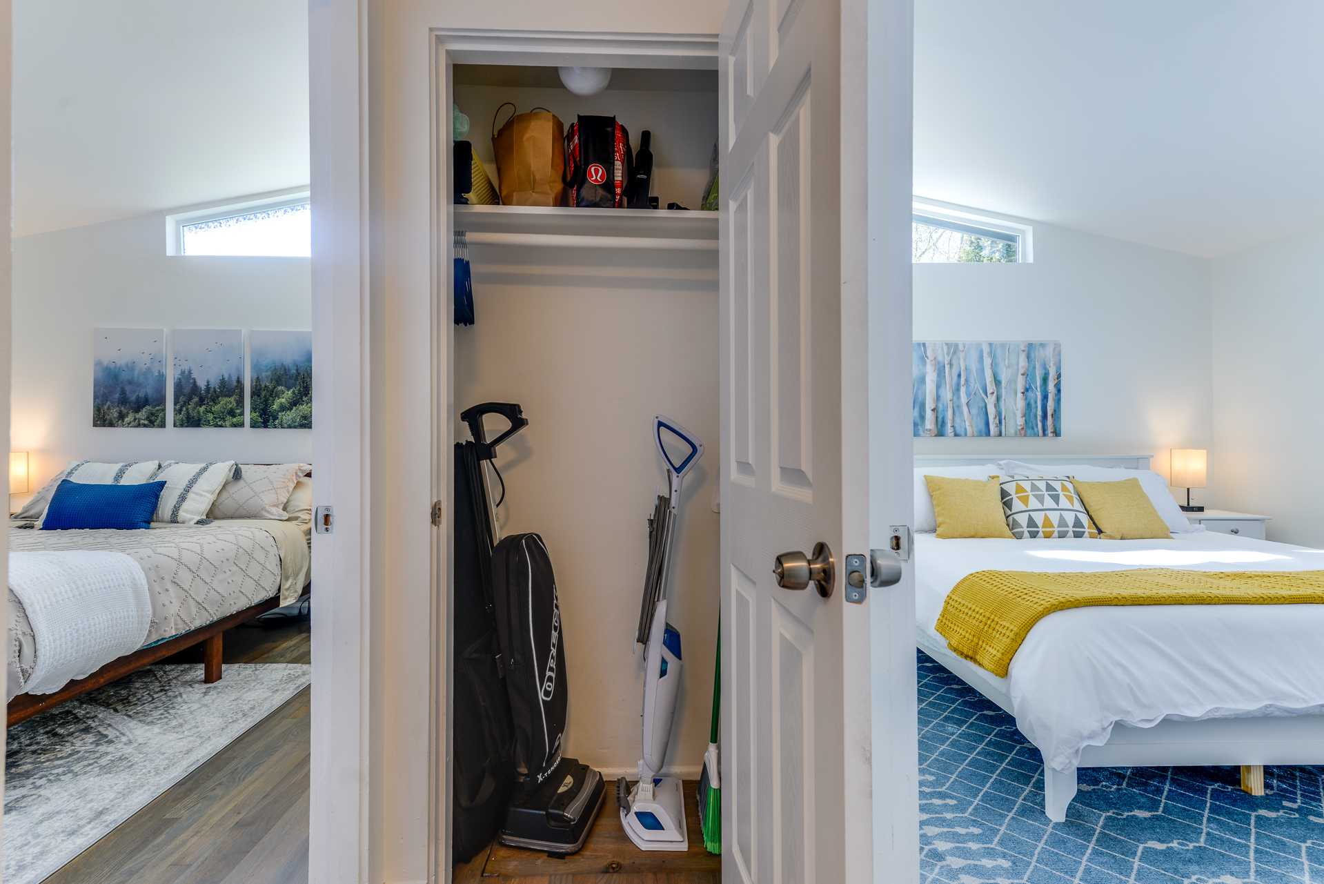 Enjoy the spacious Queen Room, also with a brand-new Casper mattress in queen size, sumptuous linens, along with bedside tables with lamps, drawers, and shelves. Take in the mid-century-modern architecture – especially evident in the bedrooms. Lull yourself to sleep watching the 32” Visio smart TV. You’ll have a closet and shoe rack for storage and a comfy side chair for relaxing, reading, or getting dressed.