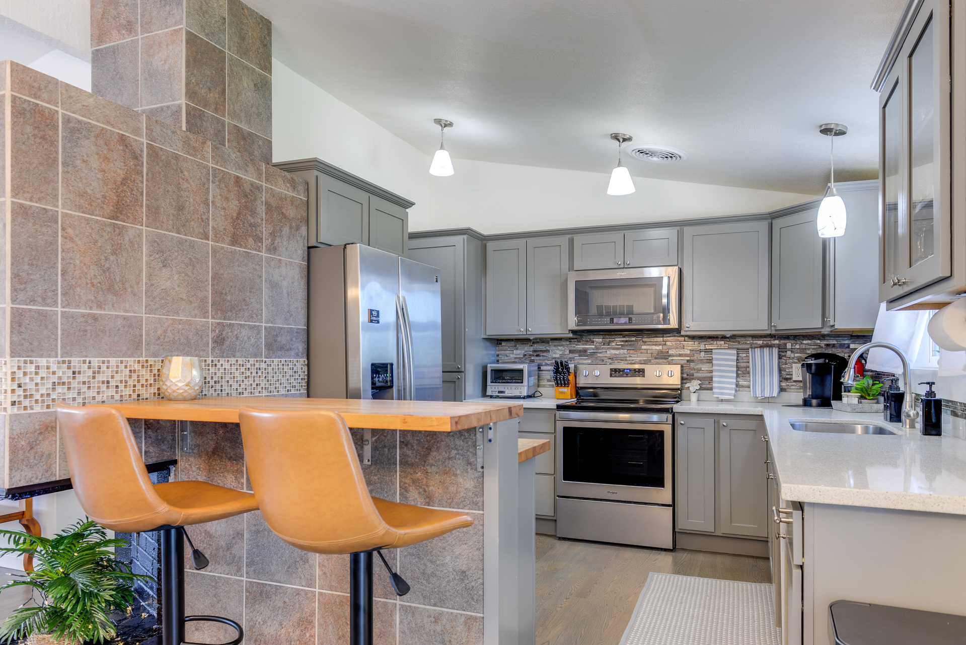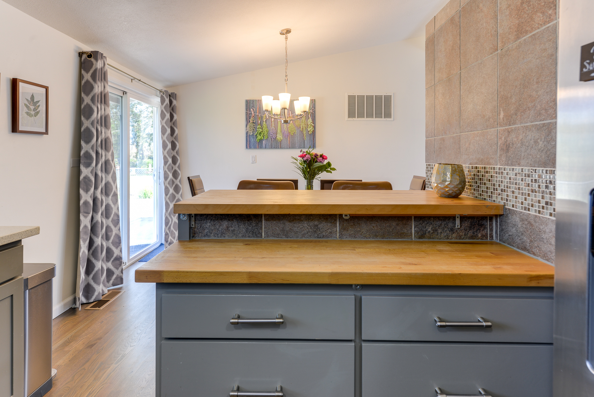 Dine at the dining table with chairs and bench seating with room for 7 with a view of the backyard, easily accessible through sliders. Two barstools at the kitchen peninsula provide supplemental dining seating and are also a sweet spot for sipping a beverage or enjoying a snack.