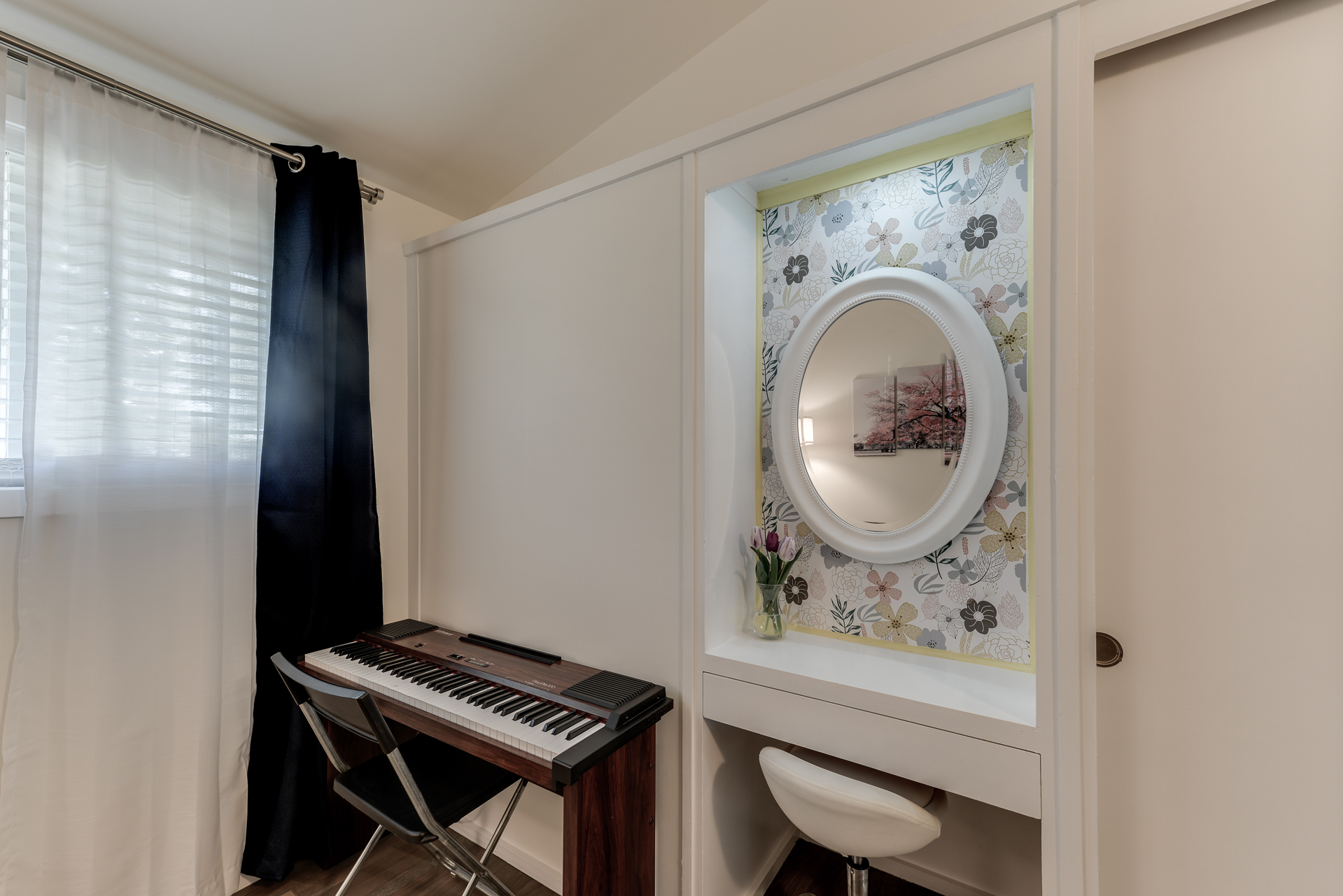 To accommodate additional sleeping needs, you’ll find a futon (bedding on request) in the sitting room, a multipurpose room with vanity/sitting area and electric piano (bring your own headphones if you’d like to play it). You’ll also find some games and books here, along with all the yard games in the closet. A luggage rack and hangers provide storage.