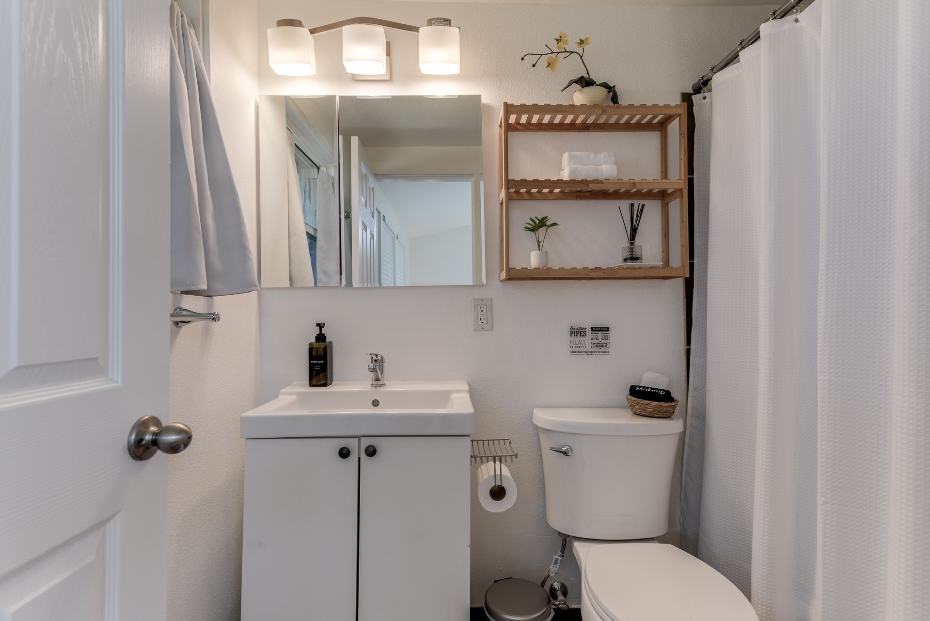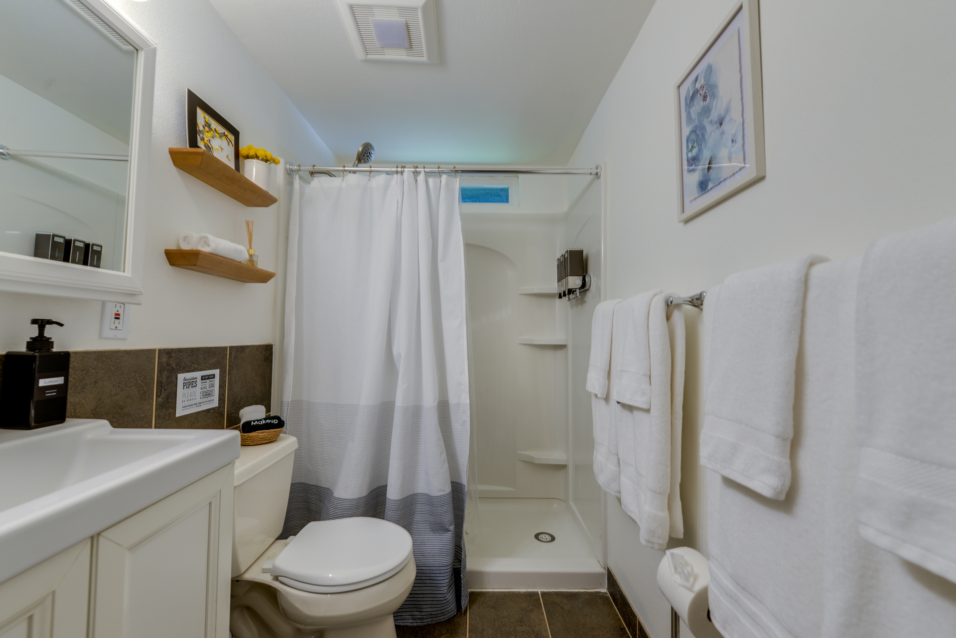 Refresh and rejuvenate in the common bathroom with shower and all bathroom essentials. Amenities include hand-held showerhead option, hairdryer, hand-held mirror, paraben-free and sulfate-free toiletries. Special bonus is the extremely low shower pan for easy in-and-out access.