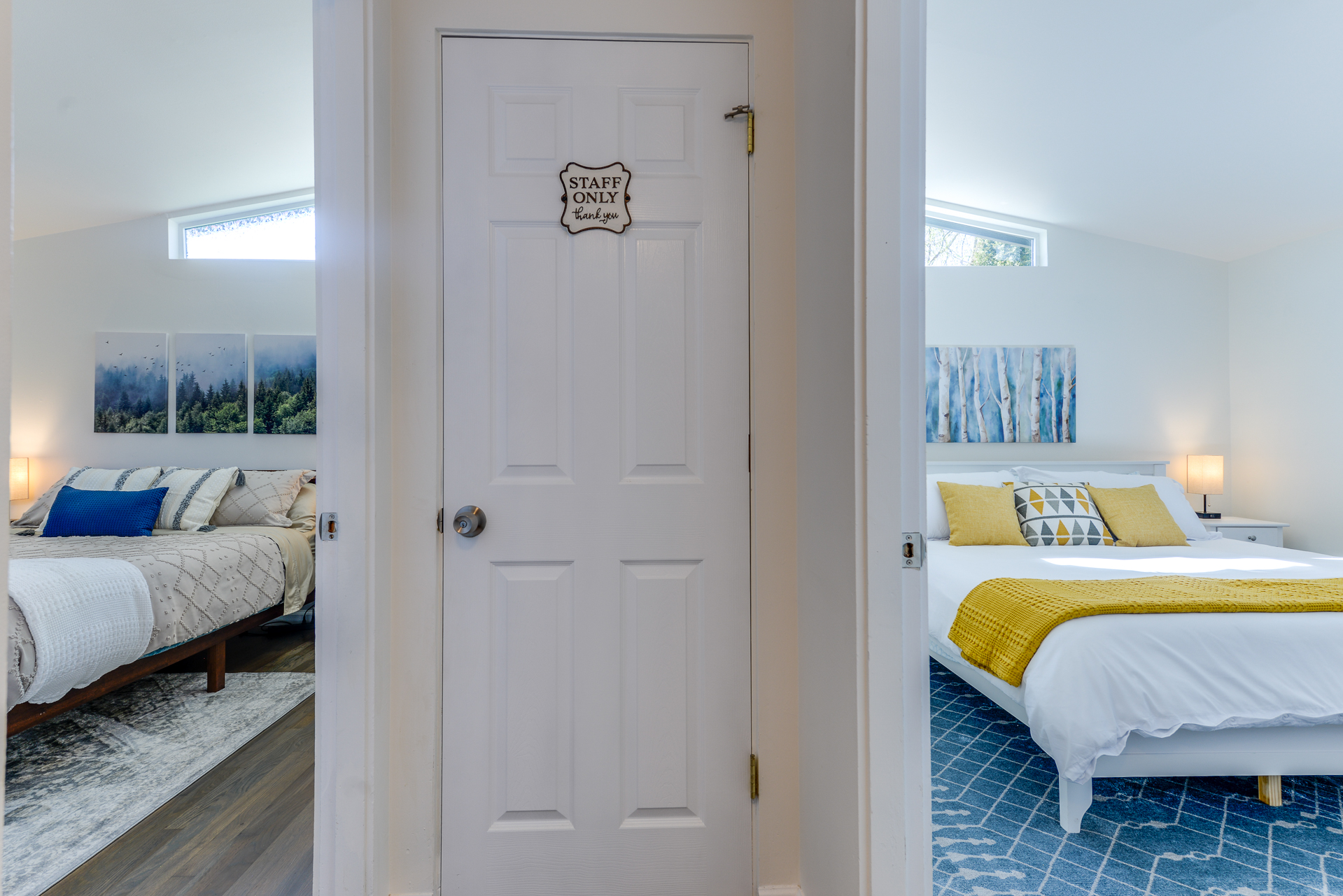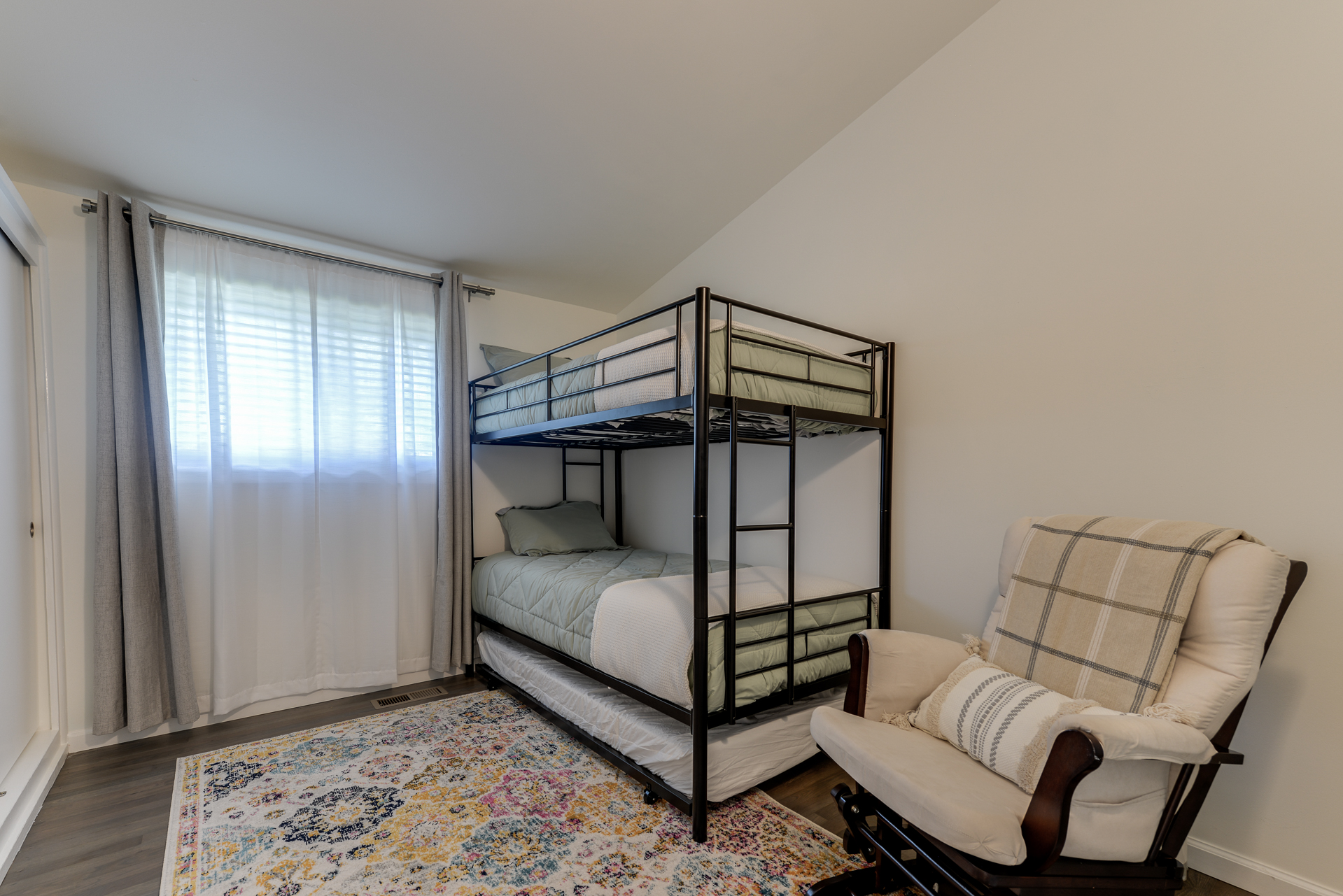 Kids and kids-at-heart will love the Twin Room, where a bunk bed with pull-out, floor-level trundle provides three twin-size beds and a glider/rocking chair for grownups to cuddle kiddos and read to them. We can provide a little extra bumper if there is any concern about your kiddo rolling out of the middle bed. Storage is available in the closet, luggage rack, and the room’s built-in shelving.